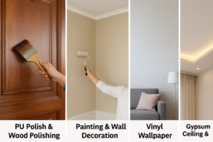 • PU Polish & Wood Polishing: We expertly apply PU (Polyurethane) and Melamine polish to enhance the beauty and longevity of your wooden furniture, doors, and flooring.
